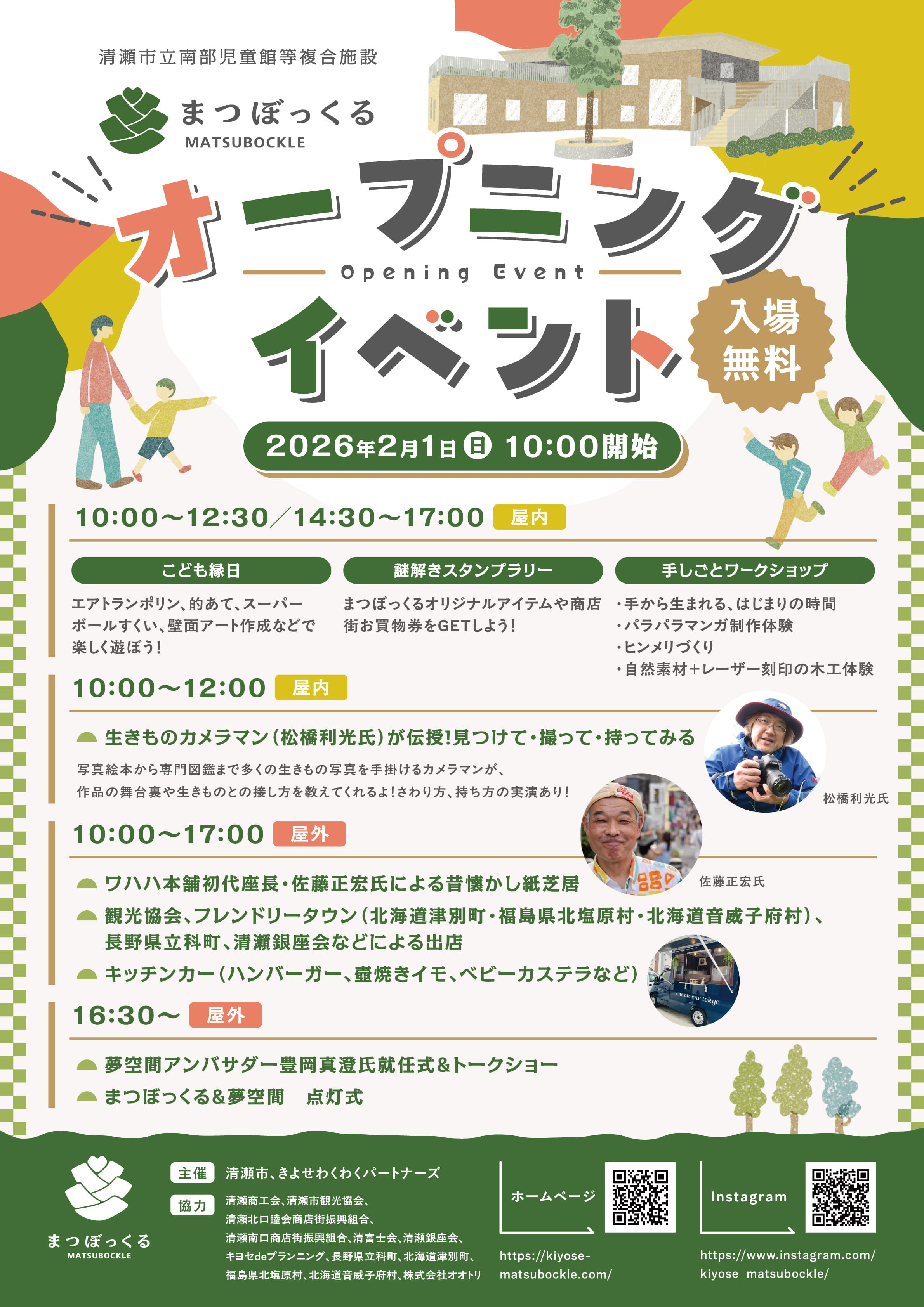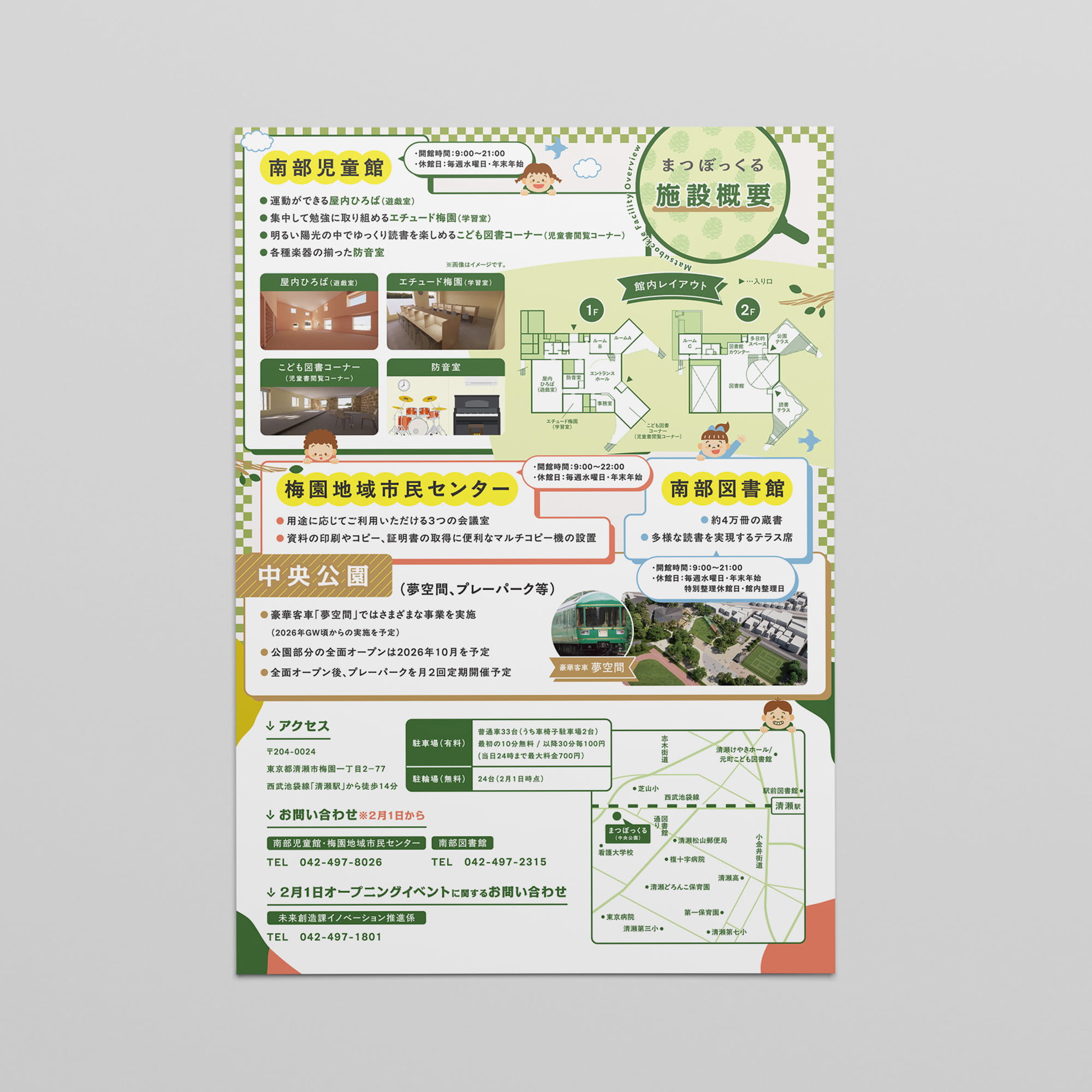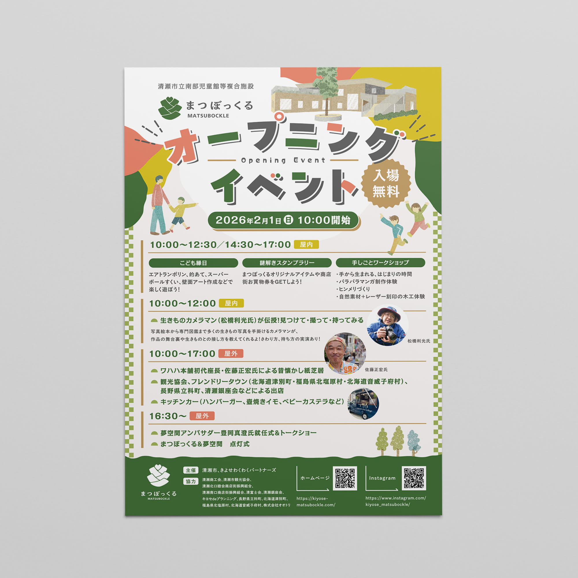 清瀬市に新たに誕生する児童館等複合施設「まつぼっくる」のオープニングイベントのチラシとポスターのデザイン。